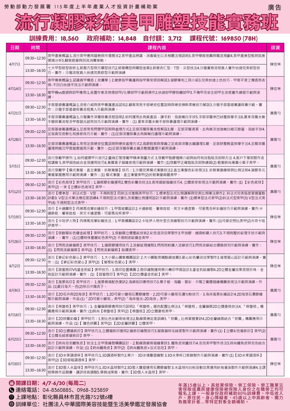 上課日期:4/07–6/30(每週二)9:30–16:30